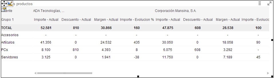 Hay una única dimensión vertical, que se trata del grupo de productos del "Grupo 1". Además de ambas dimensiones, se muestran los