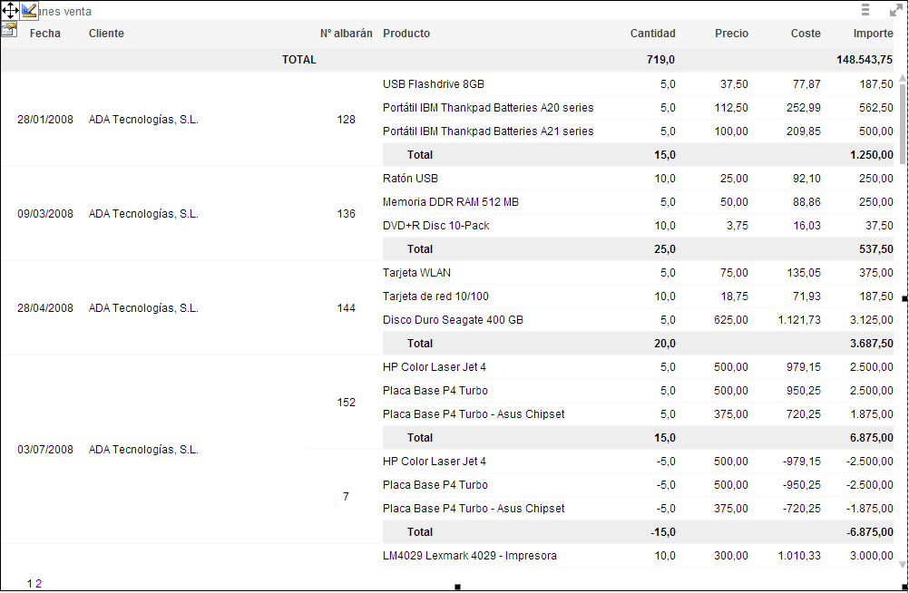 su vez se agrupan por número de albarán, cliente y fecha.