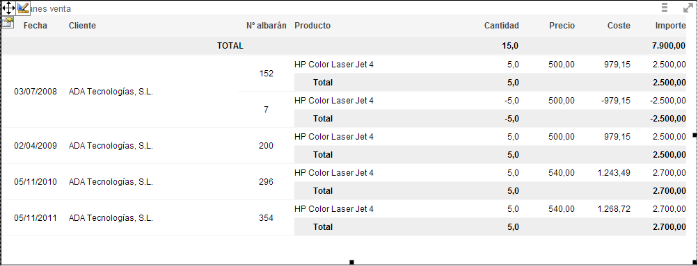 "HP Color Laser Jet 4", aparece una única página de resultados con todos los albaranes del cliente que contienen ese producto.