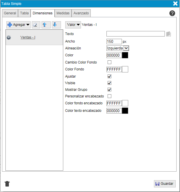- Ancho. Número de píxeles que medirá de ancho la columna que contendrá los valores de esa medida o grupo de medidas.