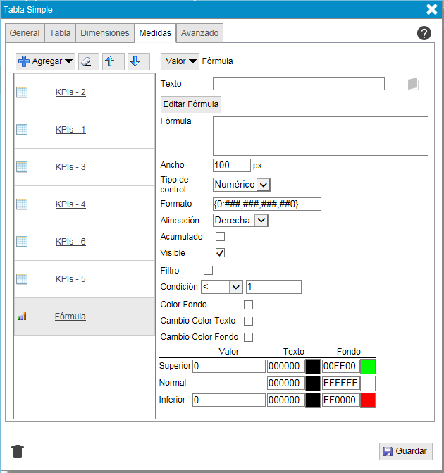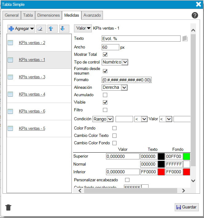 rellenarse el campo "Inferior", se aplicarán los colores de su fila cuando el valor de la medida sea menor que el
