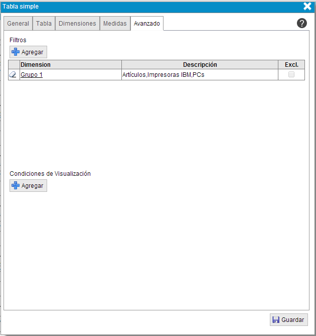 - Visible. Opción que permite mostrar u ocultar la columna que contendrá los valores de la dimensión o grupo de dimensiones.