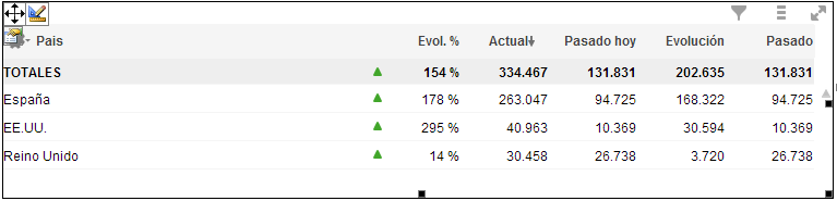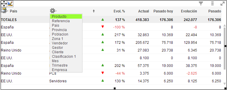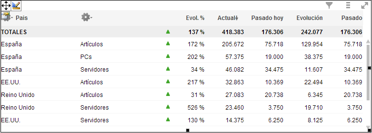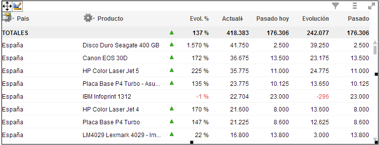 Si en la figura anterior se selecciona la dimensión "Producto", a continuación se muestra la tabla resultante. Ahora los datos de