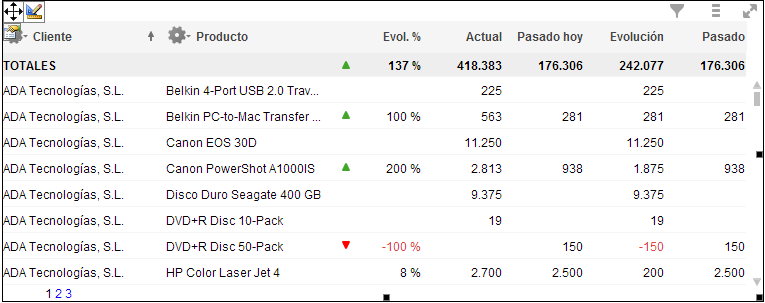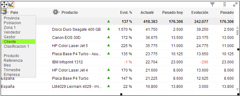 Al seleccionar en la primera columna la dimensión "Cliente" el resultado se puede ver en la siguiente figura. Ahora los datos de los productos