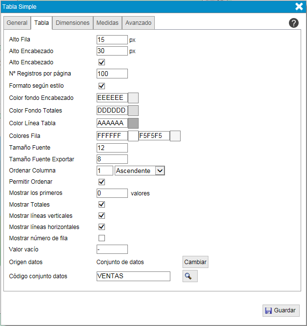 - Colores Fila. Colores que se aplican a las filas de la tabla de forma intercalada, sólo si la opción "Colores según estilo"