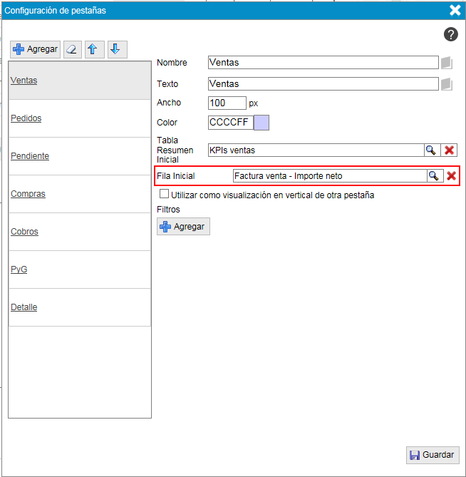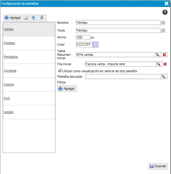 Para crear nuevas pestañas se debe pulsar en "Agregar". A continuación se añadirá al final de la lista la nueva pestaña creada. Se debe seleccionar