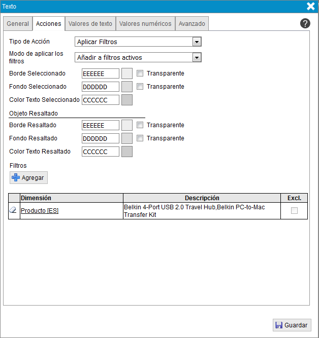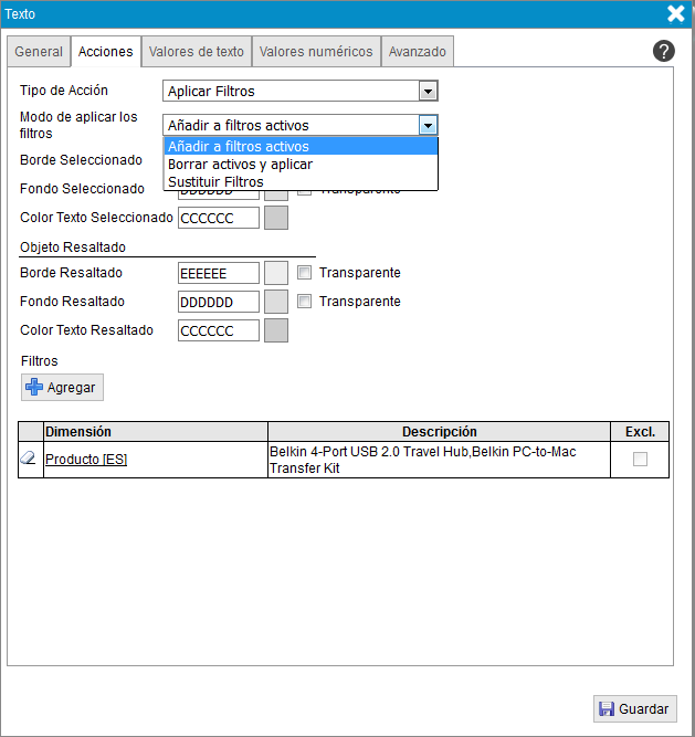 - Sustituir filtros. Aplica los filtros definidos en el objeto y si algún filtro de dimensión aplicado coincide con otro de la lista, modifica su valor por el del filtro del objeto.