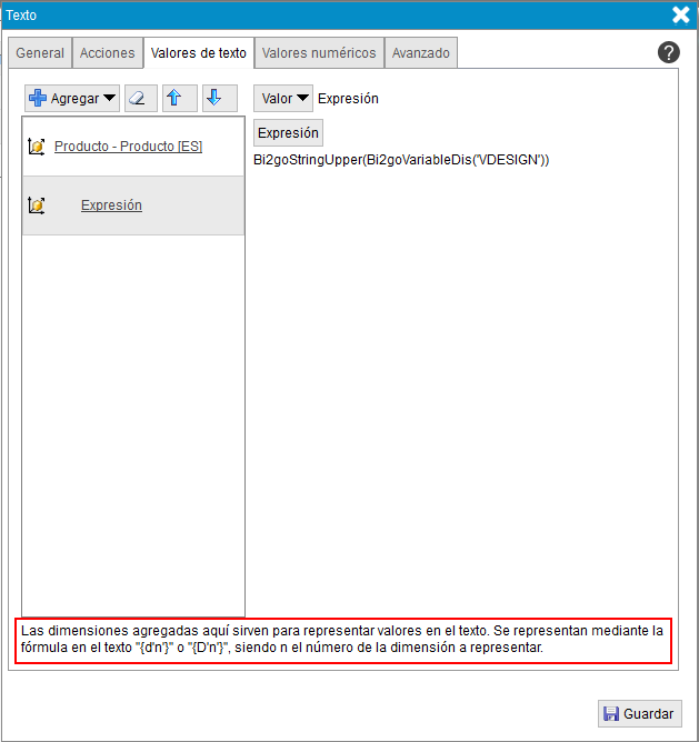 Las dimensiones y expresiones agregadas aquí sirven para representar valores en el texto. Se representan mediante la fórmula en el texto "{d'n'}" o "{D'n'}", siendo n el número de la dimensión a representar. Como las dimensiones constan de varios valores se mostará el primero de toda la lista que devuelva.