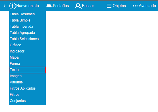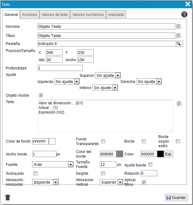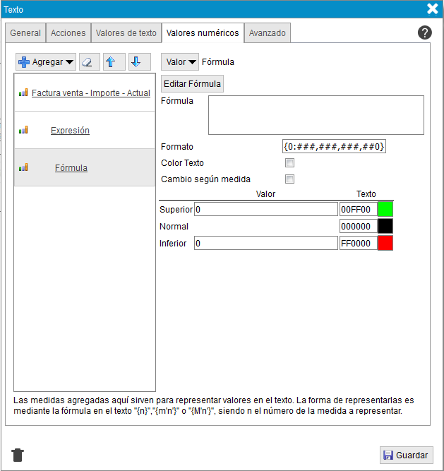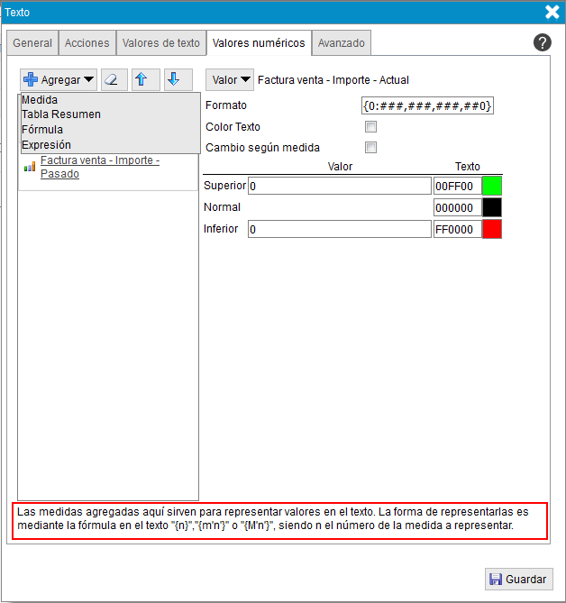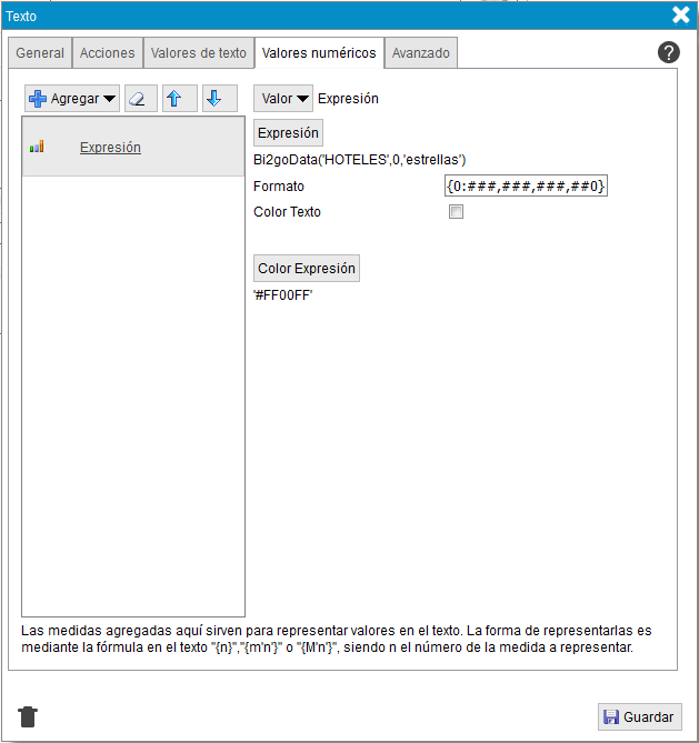 - Texto. Información que se muestra en el objeto. Si ademas de un texto quiere mostrar el valor de una medida/columna de la tabla resumen, debe agregar la medida/columna en la pestaña medidas y poner en este campo {n}