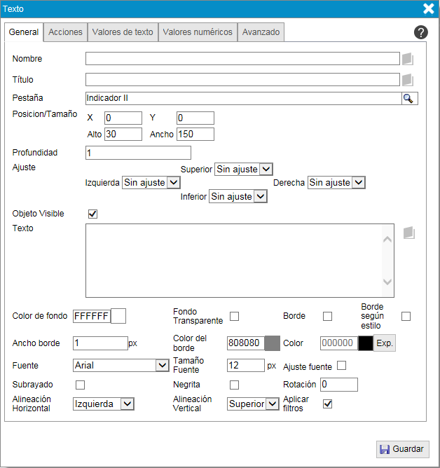 La configuración de este objeto dispone de la pestaña general y de la pestaña avanzado, que se han explicado anteriormente en este manual, pinche en los siguientes links y siga las indicaciones: