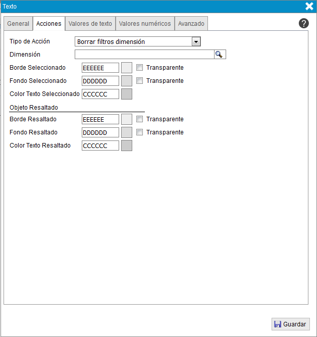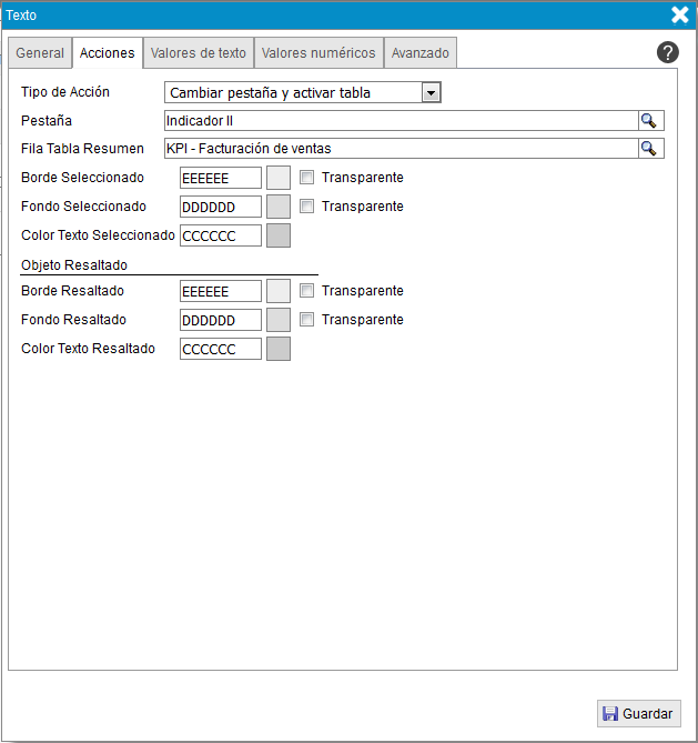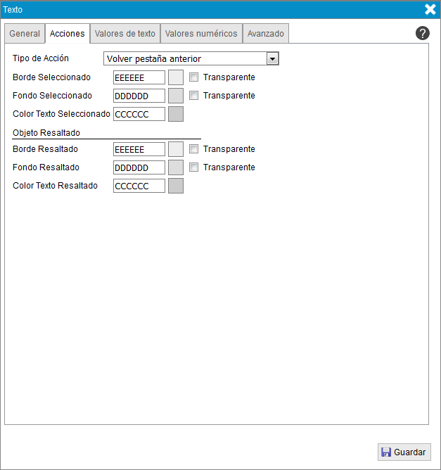 - Color texto seleccionado. Color del texto cuando se selecciona el objeto.