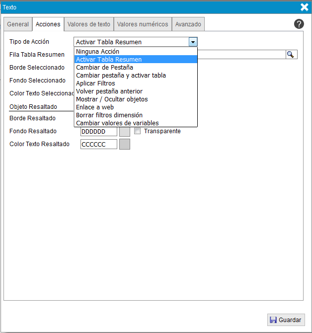 - Fila tabla resumen. Indica la fila de la tabla resumen que se activa al hacer clic sobre el objeto texto.