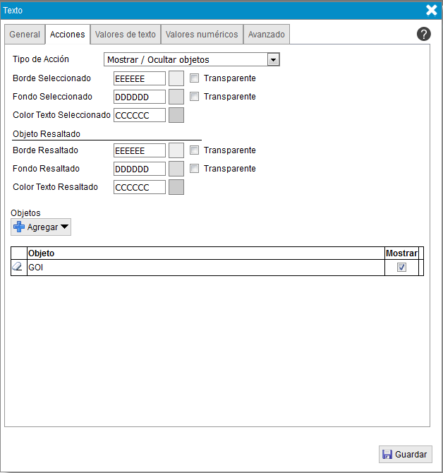 Si la acción que va a realizar es la de mostrar u ocultar objetos, se habilitarán los siguientes campos