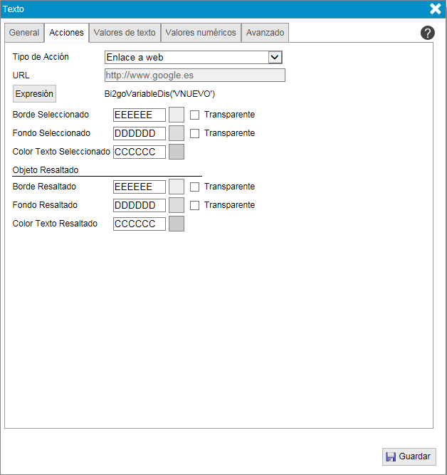 Cuando un elemento es de este tipo sólo estarán activos los campos de formato y cambio de color. También se habilita un campo nuevo de expresión para el color del texto.
