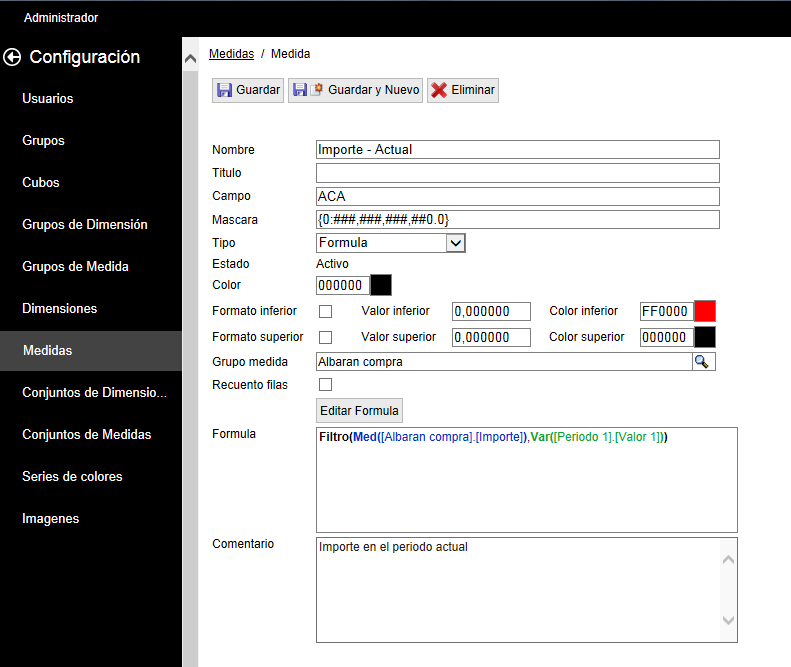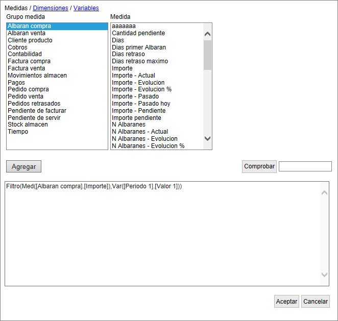 - Medida: es el valor de una medida sobre el que se aplicará el filtro, es el reultado de la función Med.