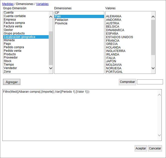 Filtro(Med([Factura venta].[Importe]),Dim([Localización geográfica].[Pais].[ESPAÑA]))