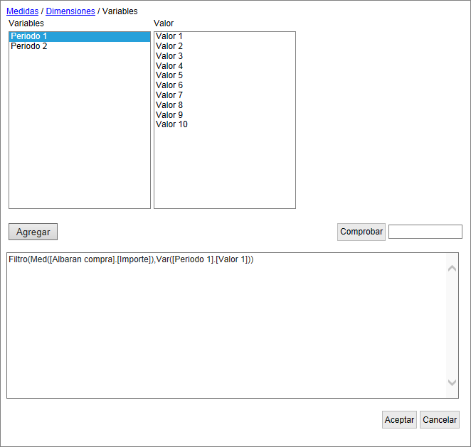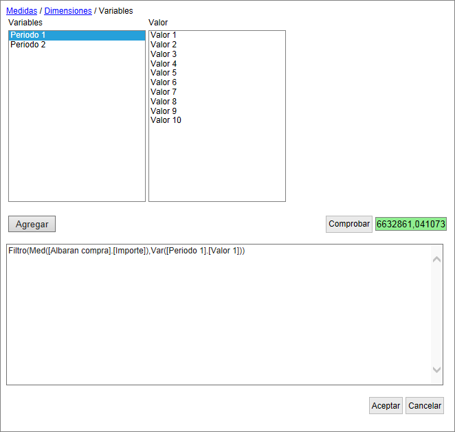 Filtro(Med([Factura venta].[Importe]),Var([Periodo 1].[Actual]))